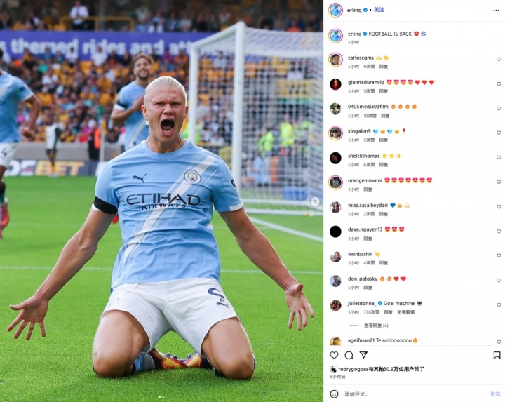 开云智能体验-哈兰德更新社媒庆祝英超开门红,罗德里戈点赞